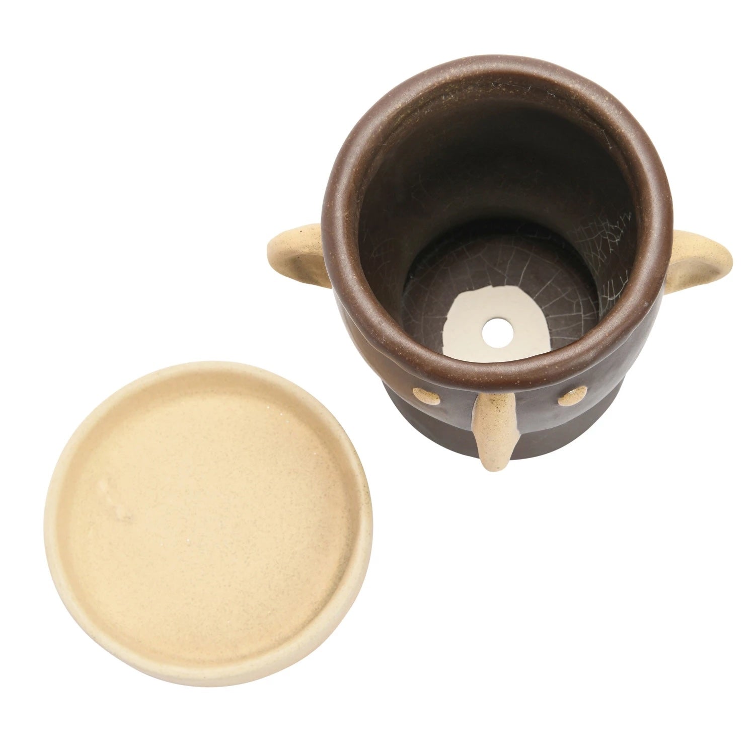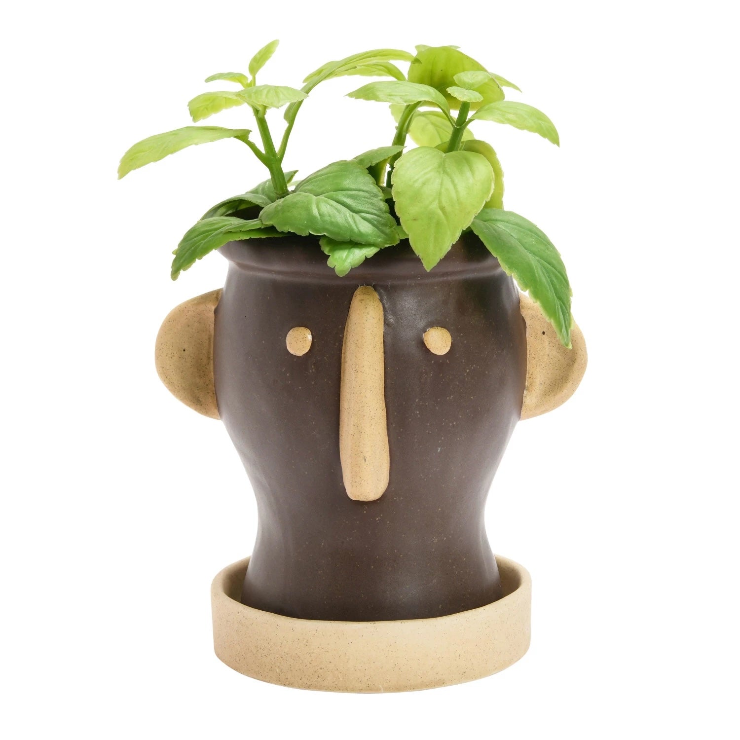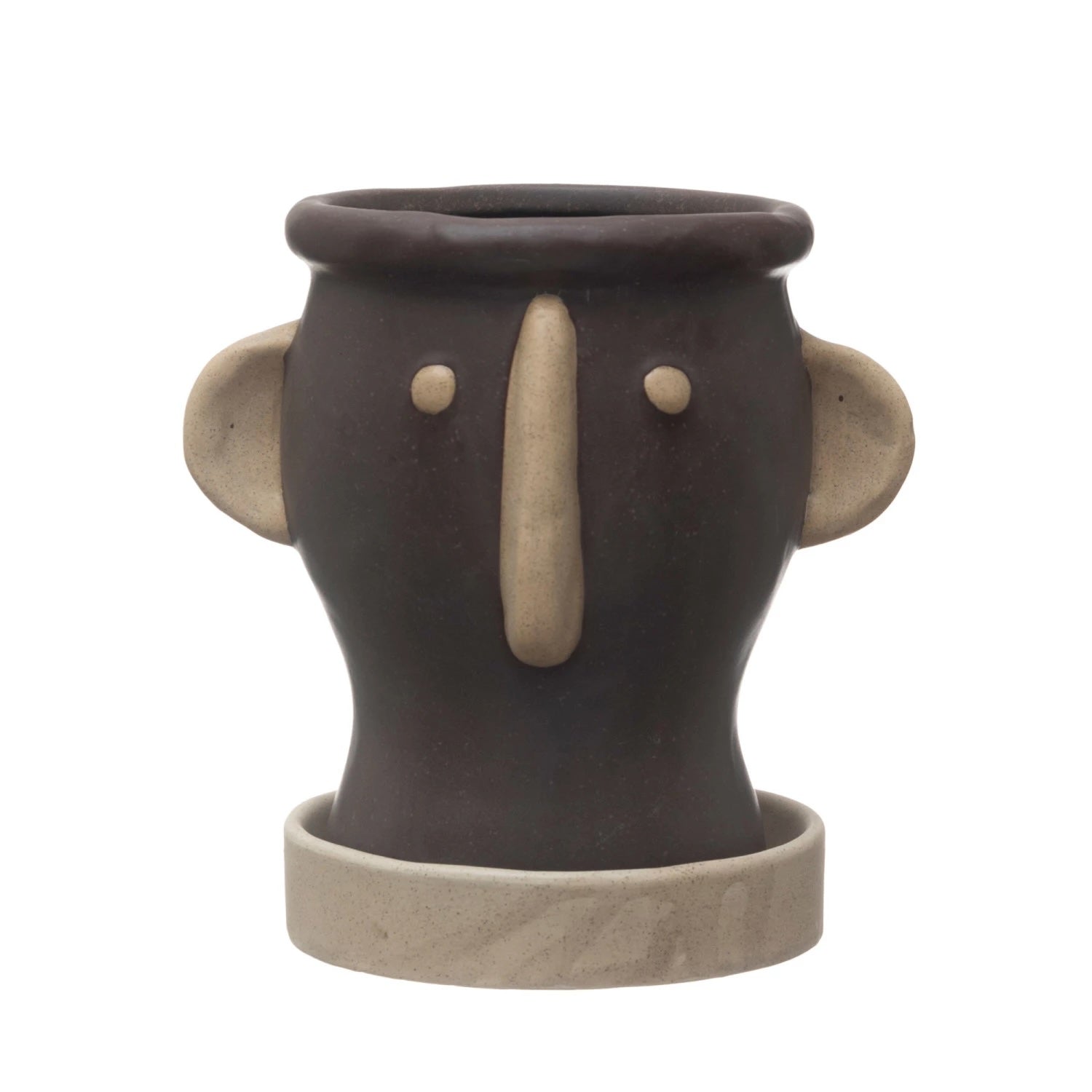 5" Round x 6-3/4"H Stoneware Face Planter w/ Saucer, Brown & Cream Color, (Holds 4" Pot)