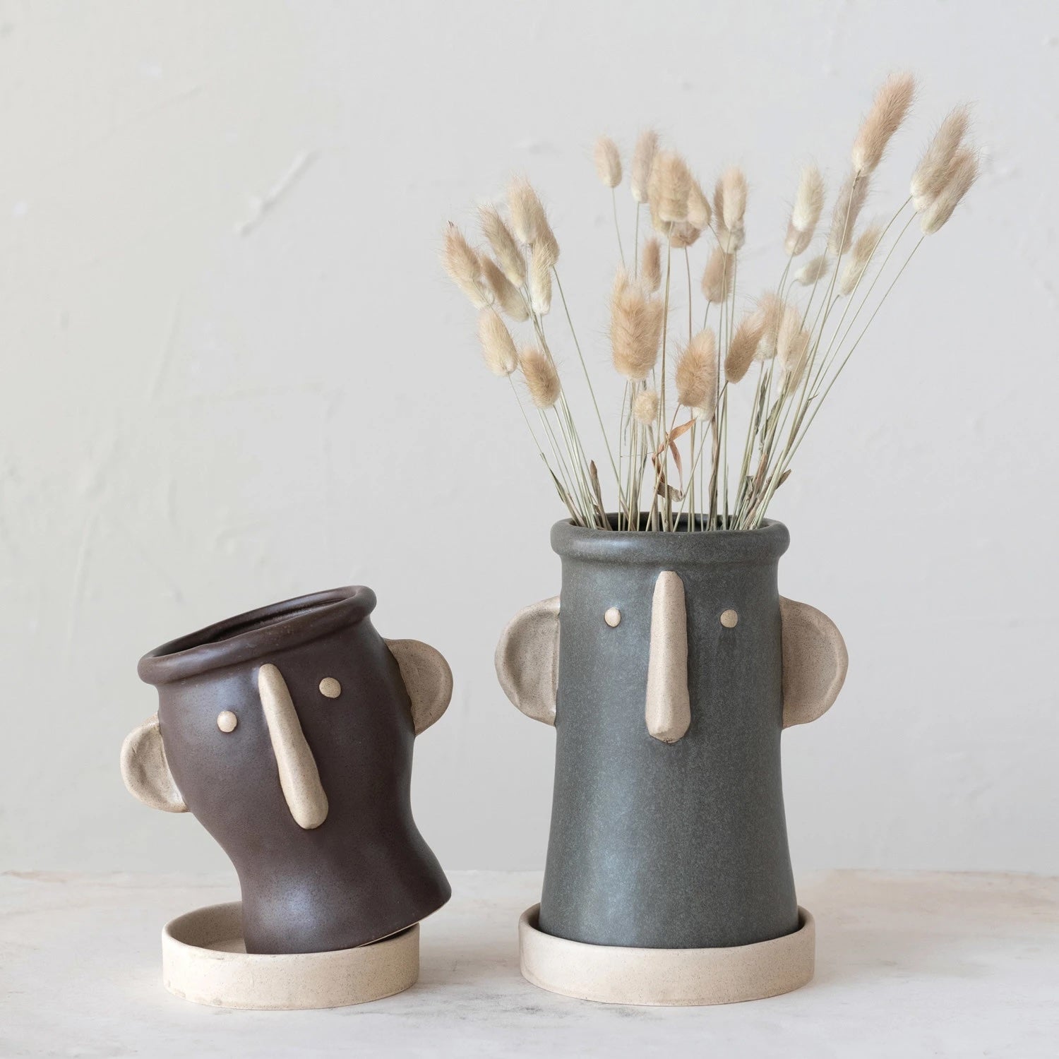 This playful stoneware planter showcases a minimalist 2-tone face in a stylish matte finish.