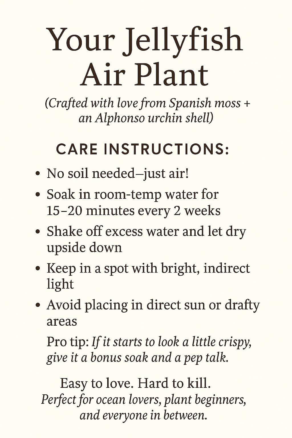 Bring a touch of whimsy to your space with this handmade Jellyfish Air Plant Hanger. Each one is crafted to resemble a floating jellyfish, with a sea urchin shell ‘head’ and a live Spanish Moss air plant trailing like tentacles. No soil required—just light misting and bright, indirect light keeps it happy. Perfect for coastal decor lovers, plant enthusiasts, or anyone who wants a unique piece of living art. Great for bathrooms, windows, offices, or gifting!