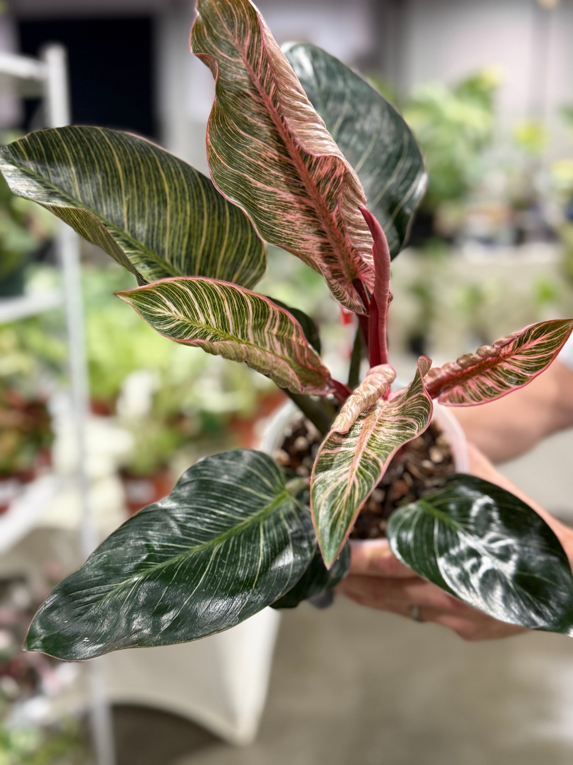 - Growth Habit: Compact, upright philodendron with pink-and-white variegated leaves